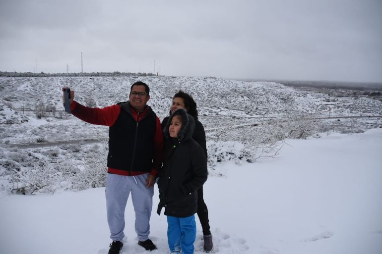 Miles de vecinos salieron a las calles para disfrutar de este fenómeno atípico en la ciudad y tomarse una foto con la nieve. El manto blanco cubrió todo Neuquén, pero se hizo más visible en parques y plazas.