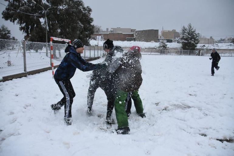 También los puentes y el río Limay dejaron una postal invernal que hace recordar a la cordillera y en algunos colegios los alumnos a aprovecharon los recreos en el patio para jugar con los copos.