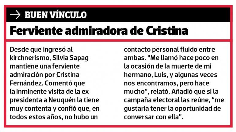 Era abril de 2005 cuando Felipe Sapag recibió en su casa a Oscar Parrilli para hacer público su apoyo al entonces presidente, Néstor Kirchner. En ese momento, Silvia ya había definido su acercamiento al santacruceño. Hoy, la hija del fundador del Movimiento Popular Neuquino es la segunda candidata al Senado por el Frente de Todos, con grandes chances de ocupar una banca. Si las urnas los dan ganadores en octubre, volverá a la Cámara Alta luego de dos décadas, esta vez con el sello K.