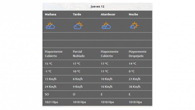 Desde la Autoridad Interjurisdiccional de Cuencas (AIC) informaron que para este jueves se espera un cielo mayormente cubierto durante el día hasta la noche donde estará despejado. Las temperaturas oscilarán entre los 17°C de máxima y -1°C de mínima. Se esperan ráfagas de viento de hasta 38 km/h.