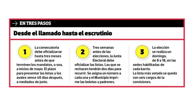 En cada barrio se eligen presidente, vice, secretario, tesorero y cinco vocales. Quienes ganen ahora tendrán cuatro años de mandato, hasta 2022.