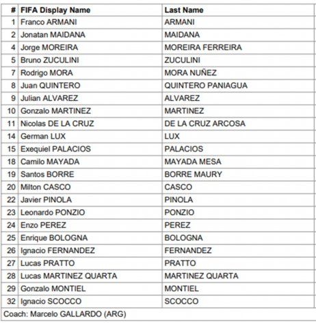 De cara a ese calendario, Marcelo Gallardo, sin sorpresas, confeccionó la lista de 23 futbolistas para la cita en los Emiratos Árabes. El cipoleño Ezequiel Centurión, cuarto arquero del plantel, no ingresó en la nómina aunque de todas maneras acompañaría al plantel.