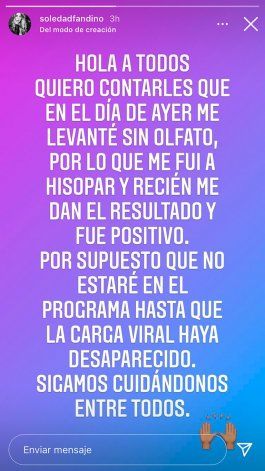 “Hola a todos. Quiero contarles que en el día de ayer me levanté sin olfato, por lo que me fui a hisopar y recién me dan el resultado, que fue positivo”, escribió Soledad Fandiño, en su cuenta de Instagram, para luego agregar, “por supuesto que no estaré en el programa hasta que la carga viral haya desaparecido. Sigamos cuidándonos entre todos”.