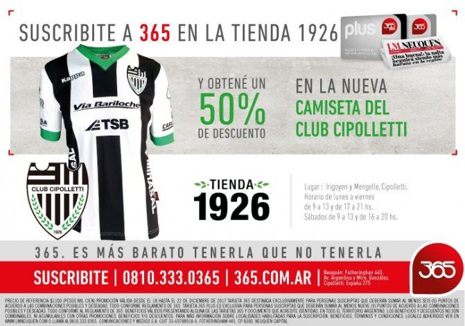 Suscribite a LMNeuquén 365 en la Tienda 1926, Irigoyen 16, Cipolletti y obtené un 50% de descuento en la nueva camiseta del Club. No te pierdas esta promo increíble hasta agotar stock!