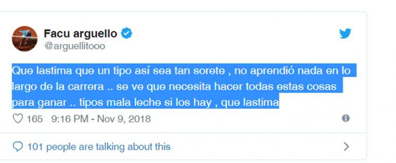 Pero no todo terminó en la cancha. Después del encuentro y aún caliente, el cordobés se volvió a descargar a través de su cuenta de Twitter. "Que lastima que un tipo así sea tan sorete , no aprendió nada en lo largo de la carrera .. se ve que necesita hacer todas estas cosas para ganar .. tipos mala leche si los hay , que lastima", tiró el tenista, aunque horas después borró el mensaje.