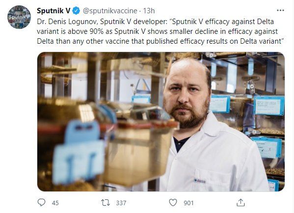 Los últimos días de junio, el Dr. Denis Logunov, desarrollador de la vacuna Sputnik V, usó su cuenta de Twitter para informar el resultado del estudio realizado por el Instituto Gamaleya sobre la efectividad de la Variante delta en contra del Covid-19.