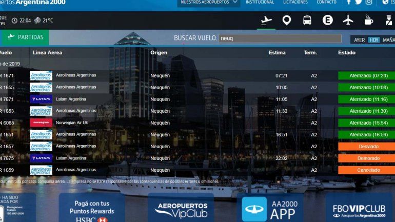 También se vieron afectados los vuelos 1657 de Aerolíneas y 7675 de LATAM -que unían Neuquén con la capital del país- que fueron desviados más temprano.