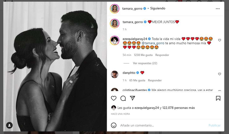 En ese mismo posteo, el exjugador del Valencia, Benfica y la Selección argentina, entre otros, contestó: “Toda la vida mi vida @tamara_gorro te amo mucho hermosa mía ”.