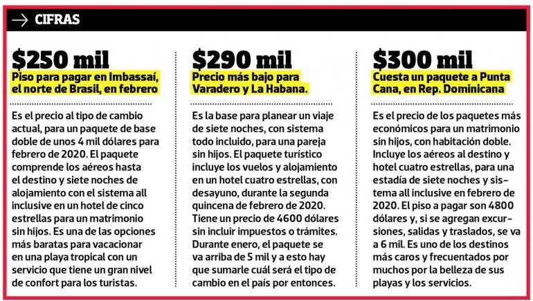 Contó que vendieron muchos paquetes a Río de Janeiro y Buzios, dos destinos económicos de Brasil, pero también a Imbassaí (junto a Salvador de Bahía), Riviera Maya, Punta Cana y Cuba, “donde tienen sistema todo incluido y todavía hay promociones de 12 cuotas sin interés con algunos bancos para los aéreos”. Añadió que esas playas vip “hoy se siguen vendiendo, porque el atractivo es que, una vez que pagan el viaje, no gastan en nada más salvo alguna excursión y no importa el tipo de cambio”.