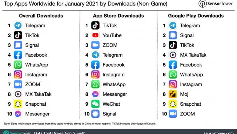 El ranking completo de las 10 aplicaciones no relacionadas con el juego en todo el mundo por descargas para enero de 2021 está arriba. Las estimaciones de descargas de aplicaciones proceden de la plataforma Store Intelligence de Sensor Tower.
