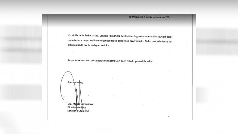 En este sentido, el primer parte médico indicó que la funcionaria evoluciona favorablemente. “En el día de la fecha la Dra. Cristina Fernández de Kirchner ingresó a nuestra institución para someterse a un procedimiento ginecológico quirúrgico programado. Dicho procedimiento ha sido realizado por la vía laparoscópica. La paciente cursa un post operatorio normal, en buen estado general de salud”, indicó el informe difundido por la institución minutos antes de las 11.
