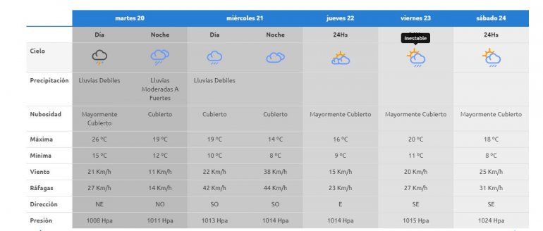 Desde el ente meteorológico esperan un día con algunas lluvias débiles durante la mañana y hasta el mediodía, para la tarde se pronostica cielo mayormente cubierto pero sin precipitaciones. La máxima estipulada es de 20 grados y la mínima de 11°C.