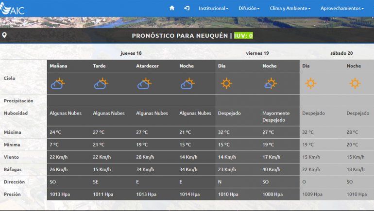 El cielo estará prácticamente despejado, con presencia de algunas durante toda la jornada en el Alto Valle. Se prevé una mínima de 7 grados y una máxima de 24 grados durante el día; en tanto que, por la tarde se incrementará a una mínima de 21 y una máxima de 27 grados; mientras que por la noche disminuirá a 15de mínima y 21 de máxima. Se prevé viento del sector este a 28 kilómetros por hora, con ráfagas de hasta 34 kilómetros por hora.