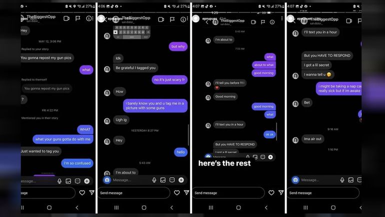 “¿Vas a repostear las fotos de armas que subí?”, le preguntó a la chica, a lo que ella contestó: “¿Qué tienen que ver tus armas conmigo?”. “Solo quería etiquetarte. Deberías estar agradecida”, sentenció el joven.