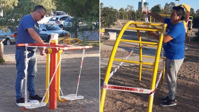 Hoy, la Muni mandó a cerrar los juegos y las máquinas de hacer ejercicio al aire libre, para que la gente no salga a la calle si no es necesario con la excusa de hacer gimnasia. En Parque Norte, por ejemplo, les colocaron fajas de clausura y de eso manera intentan sumar medidas para que los neuquinos eviten el contacto innecesario.