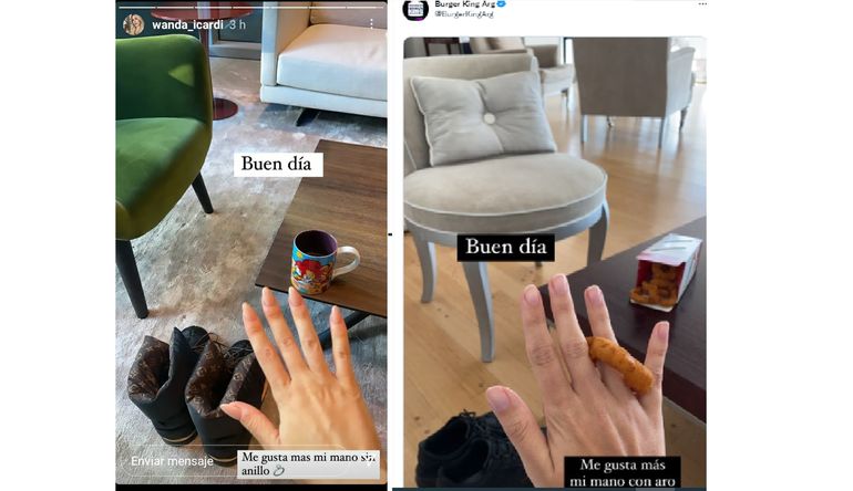 Por caso, Burger King no perdió el tiempo y transformó una historia de Instagram de Wanda, mostrando su mano sin el anillo de casada, en un aviso en redes para publicitar sus aros de cebolla. Lo hizo también en un historia de Instagram, horas después que la mediática revolucionar las redes con el posteo que confirmaba su ruptura con el padre de sus hijas.