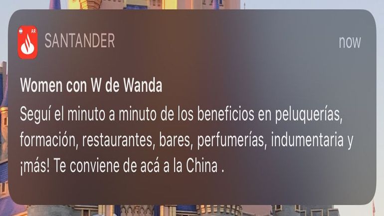 “Woman con W de Wanda. Seguí el minuto a minuto de los beneficios en peluquerías, formación, restaurantes, bares, perfumerías, indumentaria y ¡más! Te conviene de acá a la China”, decía la notificación de la app de la entidad bancaria.