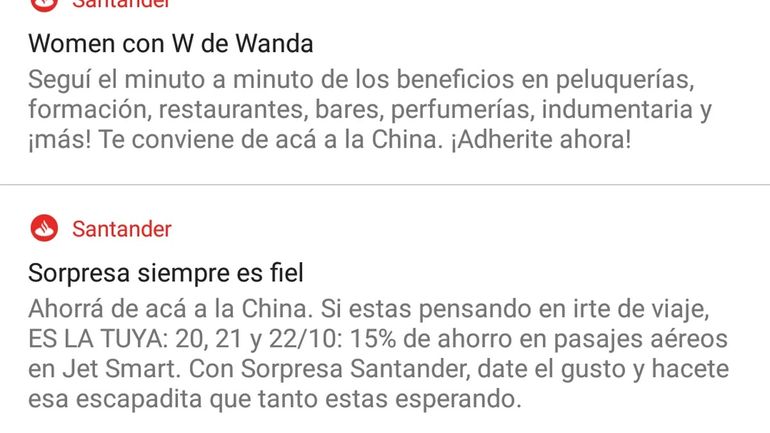 “Sorpresa siempre es fiel. Ahorrá de acá a la China. Si estás pensando en irte de viaje, ES LA TUYA…”, decía otra de las notificaciones informaba sobre descuentos en pasajes aéreos. “El que está lento es el CM (community manager) de Santander”, comentó otro usuario de Twitter, en forma irónica, al recibir la ingeniosa publicidad.