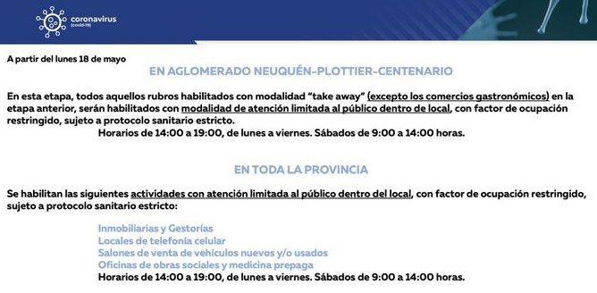 En toda la provincia, excepto el conglomerado Neuquén-Plottier-Centenario se habilita desde el lunes 11 de mayo la atención comercial con factor de ocupación restringido y protocolo sanitario estricto los siguientes rubros en el horario de lunes a viernes de 14 a 19 y sábado de 9 a 14: