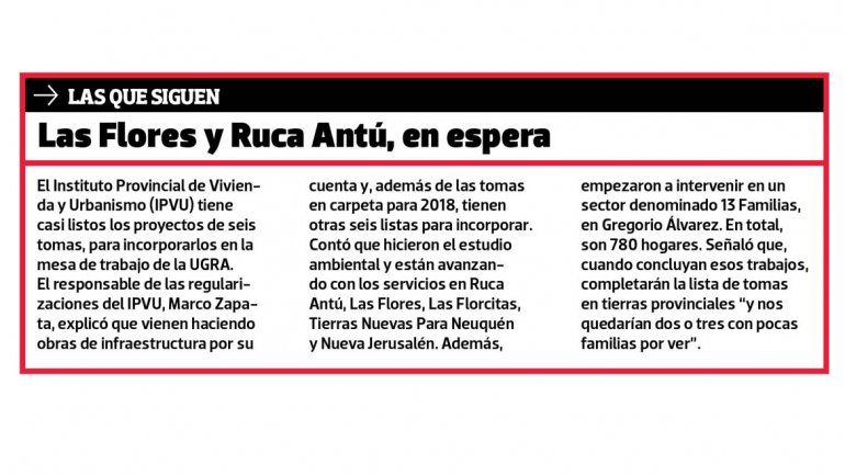 En diciembre, unos días antes de Navidad, se elevaron al Deliberante los proyectos para ordenar ocho tomas: Paimún, Tres Arroyos, La Amistad y Despo, todas del barrio Confluencia; Huertas y El Tanque, de Parque Industrial; el agrupamiento 5-10-11, de Cuenca XVI; y La Familia, en Belgrano. Esos ocho asentamientos nuclean a 1200 familias, que quedaron a un paso de la regularización.