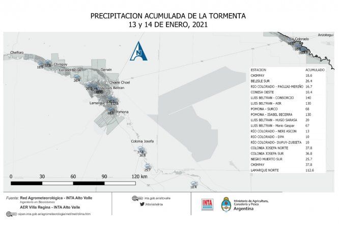 Luis Beltrán fue una de las localidades más afectadas ya que entre este miércoles y las primeras horas de este jueves acumuló más de 140 milímetros. La siguiente fue Pomona, con 130 y Lamarque norte, con 112.