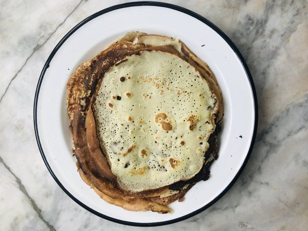 Luego calentar un sartén y agregarle un poquito de manteca para que la mezcla no se pegue y una vez que está caliente la superficie agregar una cucharada de mezcla y maniobrar para cubrir toda la superficie. Ir despegando con espátula, dar vuelta y cocinar.