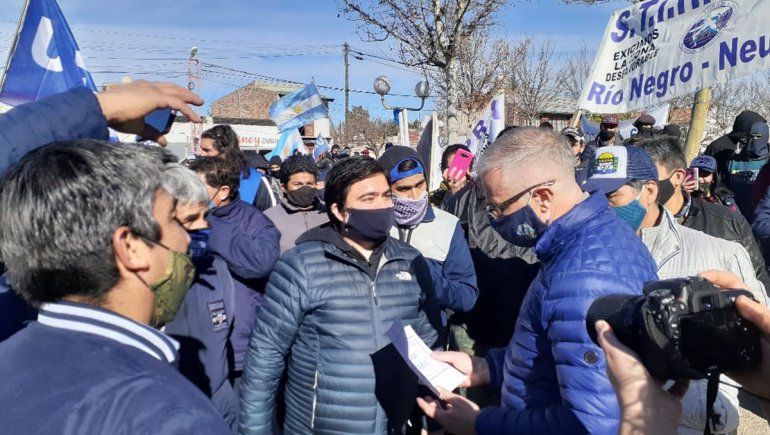 El intendente de El Chañar atendió a los trabajadores en la puerta de la municipalidad y recibió el petitorio.