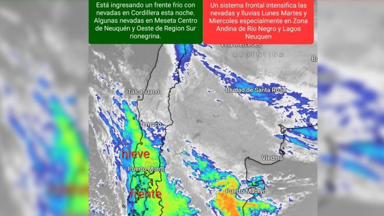 Según la AIC, para la región de los lagos continúa ingresando aire frío con lluvias y especialmente nevadas. Ingresa desde anoche un aire polar, húmedo y frío en el norte de la Patagonia. Se intensificarán las nevadas y lluvias, especialmente en zona andina rionegrina y de los lagos neuquina. Además, se extenderá al Alto Neuquén y Colorado. Pronosticó que estas condiciones se mantendrán hasta el miércoles con nevadas en montaña y ciudades cordilleranas. Viento blanco, bajas temperatura e hielo.
