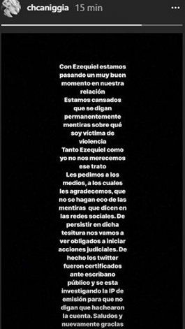 “Estamos cansados que se digan permanentemente mentiras sobre que soy víctima de violencia. Tanto Ezequiel como yo no nos merecemos ese trato”, agregó Charlotte, pidiendo a los medios que no se hagan ecos de “las mentiras”, ya que sino iniciarán “acciones judiciales“.