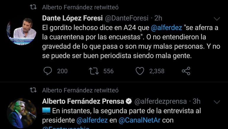 "El gordito lechoso dice en A24 que @alferdez 'se aferra a la cuarentena por las encuestas'. O no entendieron la gravedad de lo que pasa o son muy malas personas. Y no se puede ser buen periodista siendo mala gente", dice el tuit que escribió el periodista Dante López Foresi y que luego compartió el community manager del mandatario.