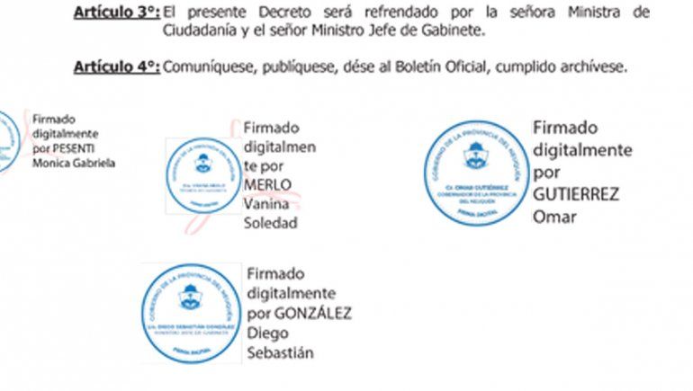 El documento lleva la firma del gobernador Omar Gutiérrez, el Jefe de Gabinete Sebastián González y Vanina Merlo.