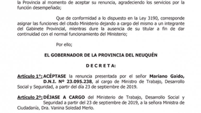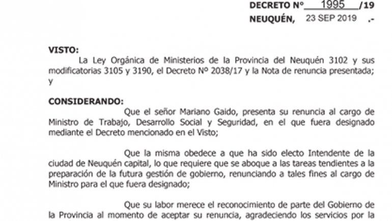 "La misma -por la decisión- obedece a que ha sido electo Intendente de la ciudad de Neuquén capital, lo que requiere que se aboque a las tareas tendientes a la preparación de la futura gestión de gobierno, renunciando a tales fines al cargo de Ministro para el que fuera designado", publicó el Gobierno, a través del decreto 1995/19.