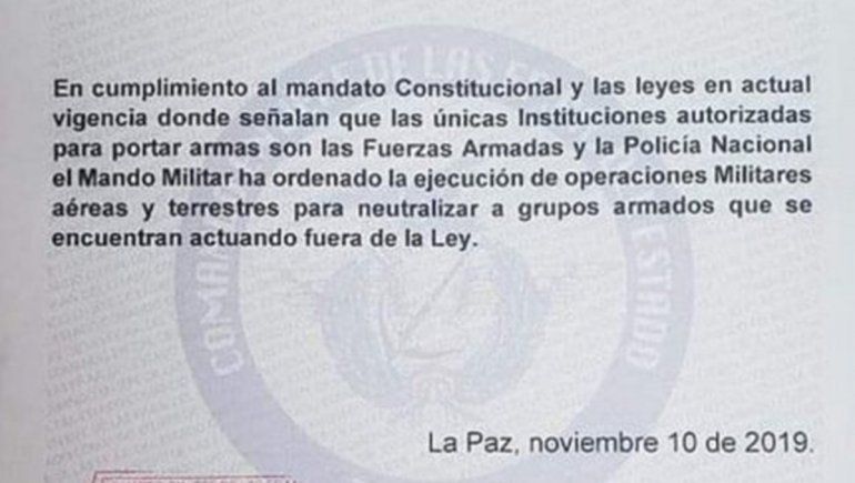 Ante la acefalía que dejó la renuncia de Evo Morales en Bolivia, las Fuerzas Armadas informaron, por medio de un comunicado, operaciones en la vía pública. Según las autoridades castrenses, hay "grupos armados" en las calles.