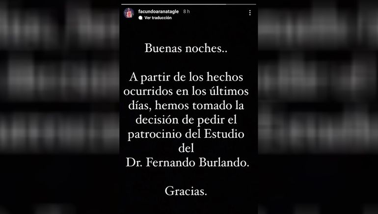 "Buenas noches", comenzó diciendo el también escritor y amante de los deportes extremos en una placa negra con letras blancas que sorprendió a sus fanáticos. Y continuó diciendo: "A partir de los hechos ocurridos en los últimos días, hemos tomado la decisión de pedir el patrocinio del estudio del Dr. Fernando Burlando. Gracias".