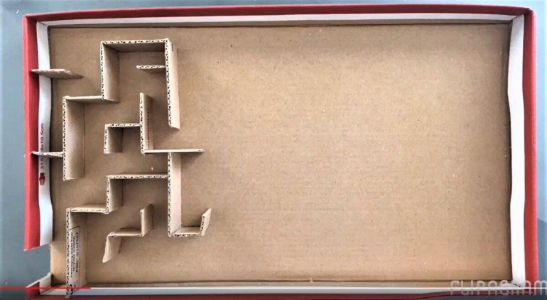 Paso a paso: En primer lugar, vamos a sacarle la tapa a la caja de cartón, pero no la vamos a tirar. Vamos a cortar cartones del ancho de la tapa y un alto de 3cm. Una vez que tenemos todas las tiras cortadas, vamos a ir armando el laberinto dentro de la caja. Pegamos cada tira de cartón con cinta de papel o con silicona caliente.