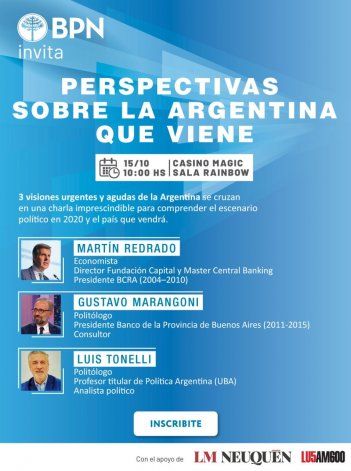 Los politólogos Luis Tonelli y Gustavo Marangoni y el economista Martín Redrado compartirán una charla en Neuquén titulada "Perspectivas Sobre la Argentina que viene" este martes 15 a las 10 en el Casino Magic, organizada por el Banco Provincia de Neuquén.