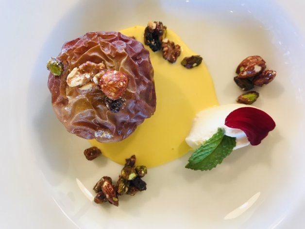Un ojo de bife perfecto con chimichurri criollo, papas ahumadas, berenjenas al escabeche y cayote en pickles.Una manzana asada, con queso de cabra y frutos secos acaramelados.