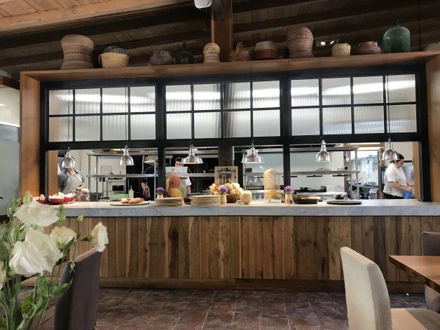 La carta de carnes nace en el patio de fuegos, donde se cocina mucha variedad. La cocina marcha las ensaladas, las pastas y los postres.