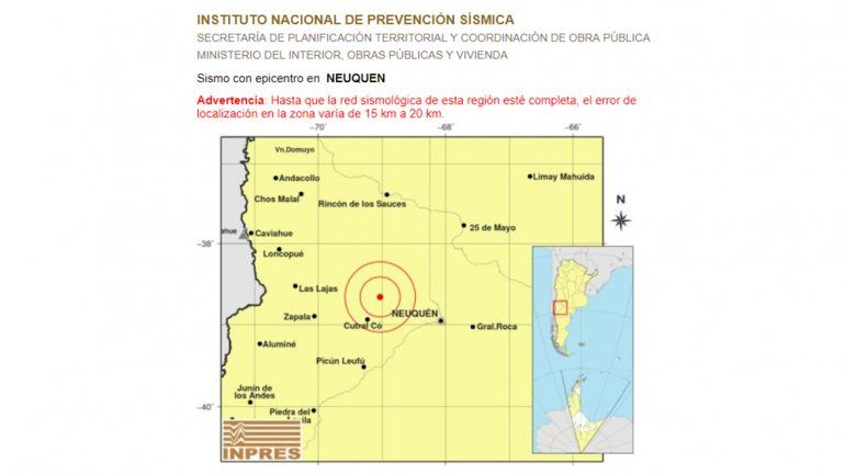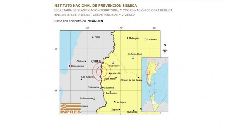 El segundo, el organismo nacional lo detectó a las 6.44 de hoy a 32 kilómetros al noreste de Cutral Co, con una magnitud de 3,2 en la escala de Richter y una profundidad de 3 kilómetros. El tercer sismo, el Inpres lo registró un minuto después, a las 6.45, pero a 34 kilómetros al noreste de Cutral Co. La magnitud fue de 2.6 en la escala de Richter y la profundidad de 3 kilómetros.