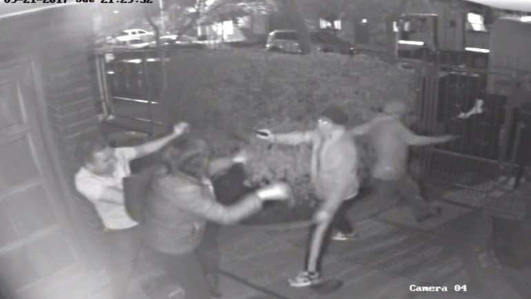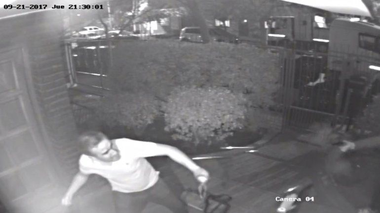 A las 21:29:46, uno de los delincuentes se abalanzó sobre Georgina y su abuelo, y el otro fue hacia Fernando, quien le dio un cachetazo para alejarlo.