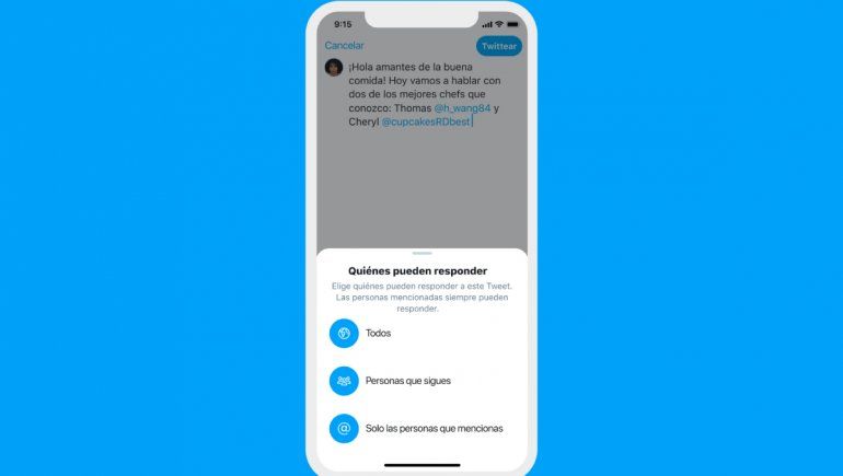 Explicaron que, si se pulsa en ese texto remarcado en azul, Twitter informa al usuario que podrá escoger quién responderá al tuit. En tal punto aclaró que las personas mencionadas en el mismo, siempre pueden responder.