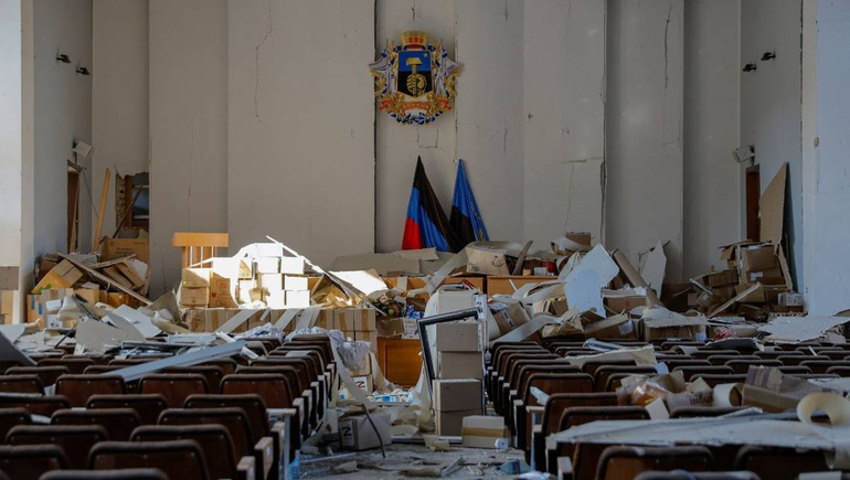 Separatistas ucranianos que controlan desde 2014 gran parte de la provincia de Donetsk dijeron que cuatro personas resultaron heridas cuando el Ejército de Ucrania disparó tres cohetes que impactaron en el edificio de la municipalidad. El edificio municipal resultó gravemente dañado por el ataque. Columnas de humo se arremolinaban alrededor del inmueble, que tenía filas de ventanas reventadas y un techo parcialmente derrumbado.