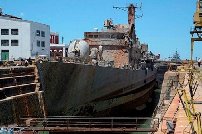 Se trata del ex-Destructor A.R.A. Santísima Trinidad, que estuvo casi tres años semihundido en la dársena de la Base Naval de Puerto Belgrano por la rotura de una válvula.