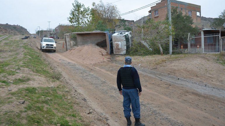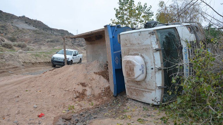 Un camión cargado de materiales volcó esta mañana en la bajada de la calle Los Paraísos, continuación de calle Huilén y rotonda de Pérez Novella, que comunica con el Parque Industrial.