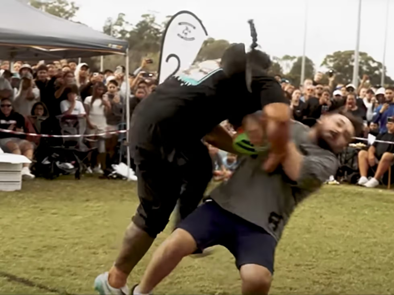 Se basa libremente en los elementos de contacto del rugby union, rugby league o la NFL y requiere dos competidores, un corredor y un placador, que corren uno contra el otro y chocan en un área de 20 metros por 4, conocida como campo de batalla.