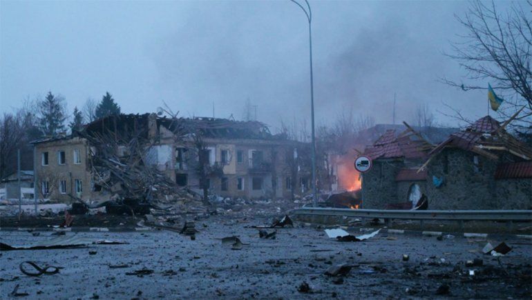 Al final de la calle, un grupo de edificios altos está consumido por el fuego. Las habitaciones quedaron al descubierto como prueba de la violencia de los bombardeos. Un edificio de nueve pisos, frente al centro comunitario de la pequeña ciudad, está casi partido en dos.