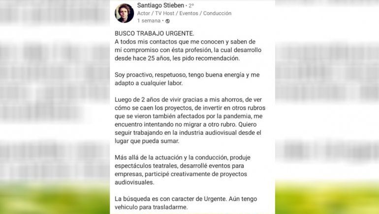 "Busco trabajo urgente. A todos mis contactos que me conocen y saben de mi compromiso con esta profesión, la cual desarrollo desde hace 25 años, les pido recomendación", comenzó diciendo en un posteo en el que se describió como "proactivo", "respetuoso", y con "buena energía".
