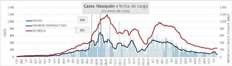 Este lunes 12 de abril, publicó una serie de tablas sobre la circulación del Covid en Neuquén durante los últimos 300 días. Allí se ve con claridad que la curva de contagios tuvo su pico el 28 de octubre del año pasado, disminuyó con altibajos a partir de noviembre y volvió a subir en enero de 2021. Desde entonces, la tendencia es hacia la disminución de los casos diarios. No obstante, en la última semana, el gráfico muestra un mínimo "salto" en la cantidad de positivos.