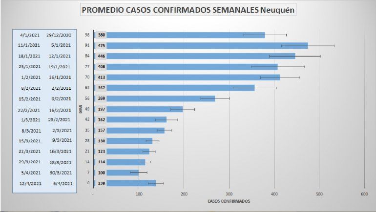 El último gráfico revela que Neuquén pasó de un promedio semanal de 475 casos confirmados a principios de enero a 138 en los inicios de abril, casi un tercio.