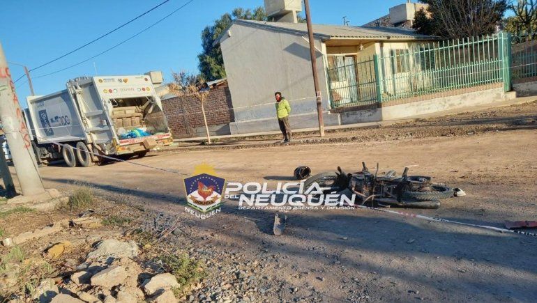 Un joven motociclista colisionó con un camión recolector de basura de Cliba en las calles de Centenario, cayó de su rodado y murió bajo las ruedas del camión. La víctima falleció en el acto y aún no pudo ser identificada. Ya se trabaja para determinar la mecánica del fatal accidente.